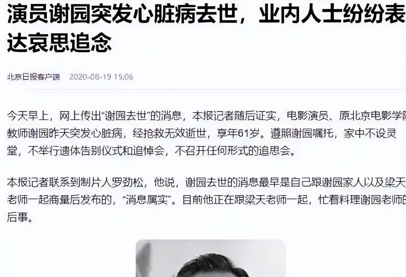 猝然离世生的洒脱,走的潇洒,谢园的离去,和他的人生一样,干脆利落。可这份潇洒,却让无数喜欢他的人,留下了无尽的唏嘘和遗憾。2020年8月18日,谢园突发心脏病,经多方抢救无效,不幸离世,享年61岁。他离世的消息,来得太过突然,没有任何预兆。